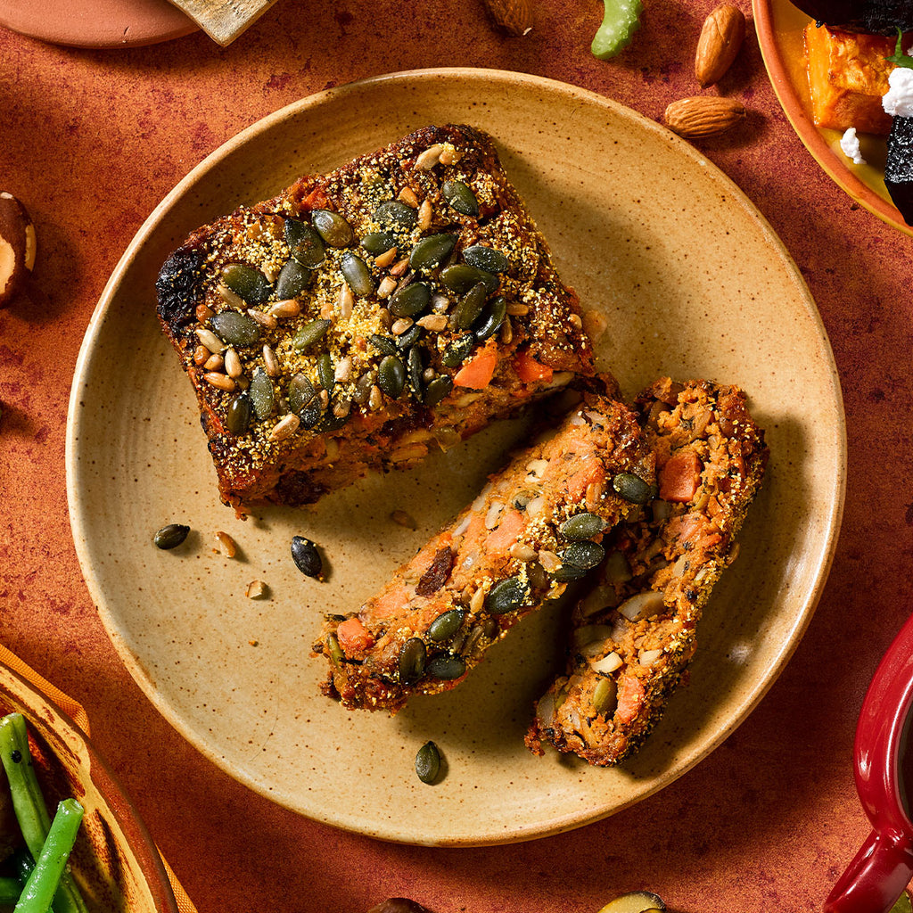 Delicious and ready to eat nut roast with chestnuts, almonds, brazil nuts, walnuts, vegetables and seeds, with crispy polenta.